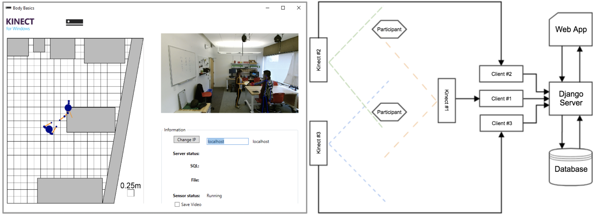 Left side: the client associated with each Kinect sensor records a screenshot of its view of the room, along with the body positions of each participant in the space. This information is sent along to the server (right side). The server merges the different streams of information, removes duplicates and performs face recognition.