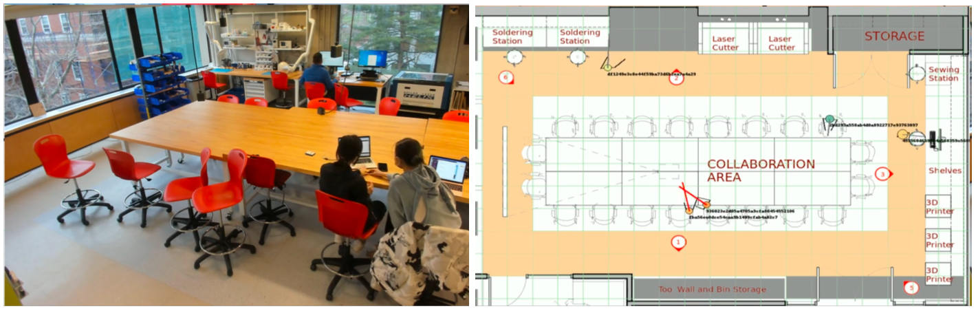 Our makerspace is equipped with 8 high resolution cameras to extract multimodal data (e.g., 3D poses, gaze direction) from videos. On the right, feed from one of the cameras shows two students working (and sharing visual attention) together, while another student is at the laser cutter station at the far wall. On the left, the same scene is represented by data captured through our system, showing the position and gaze of the three students mapped onto a floorplan of the makerspace.